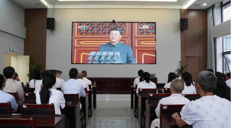 升旗仪式结束后,全体人员移步公司一楼会议室,共同观看纪念中国人民抗日战争暨世界反法西斯战争胜利80周年阅兵盛况。70分钟的盛大阅兵按照阅兵式、分列式两个步骤进行。当一系列新型武器装备公开展示,会议室内多次响起由衷的赞叹声和热烈的掌声。