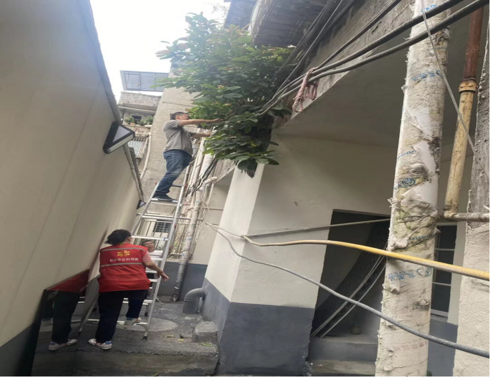 社区高度重视这一安全隐患,立即安排网格员赴现场进行详细勘查。网格员认真检查了树木的生长情况、根系扩展范围以及外墙现状,并及时联系相关业主,耐心说明外墙长树对房屋结构及人身安全可能带来的风险,获得了业主的理解与积极配合。随后,社区工作人员携带楼梯及专业工具,彻底清理了外墙树木和残留根系,并对墙体进行了全面复查,确保隐患彻底排除。