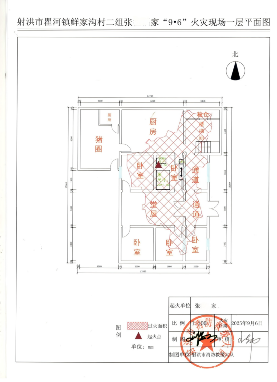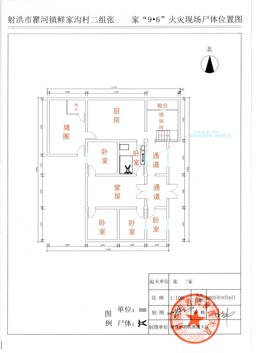 死者张x福(男,80岁,身份证号码510922xxxxxxxxxxxx,户籍地址:四川省射洪市万林乡木鱼村4组28号)现居住在射洪市瞿河镇鲜家沟村二组。据调查了解,死者患有痛风多年,2025年7月底、8月初两次住院,近期腰部轻微扭伤,行动能力受限,独居。尸体经射洪市公安局刑侦部门勘验,尸表炭化,头面部软组织完全炭化、颅骨破裂、下颌骨部分缺失;颈部组织焚毁、气管爆裂;胸腹部软组织缺失、胸骨缺失、锁骨与肋骨大部分缺失至胸腹腔内深层脏器显露,胸腹腔内有大量砂砾、泥土及碎瓦片;双上肢自肘下完全缺失,双大腿自中下段缺损,断端炭化。