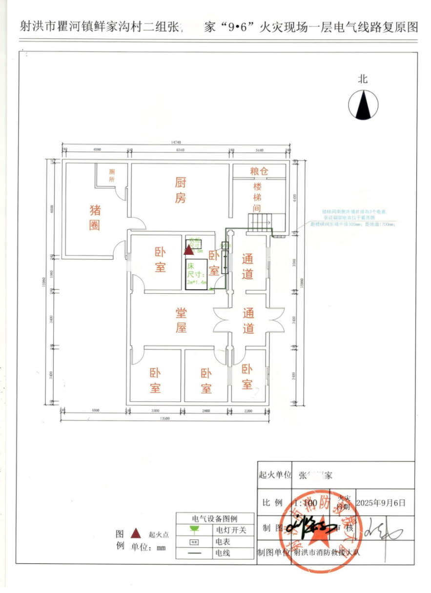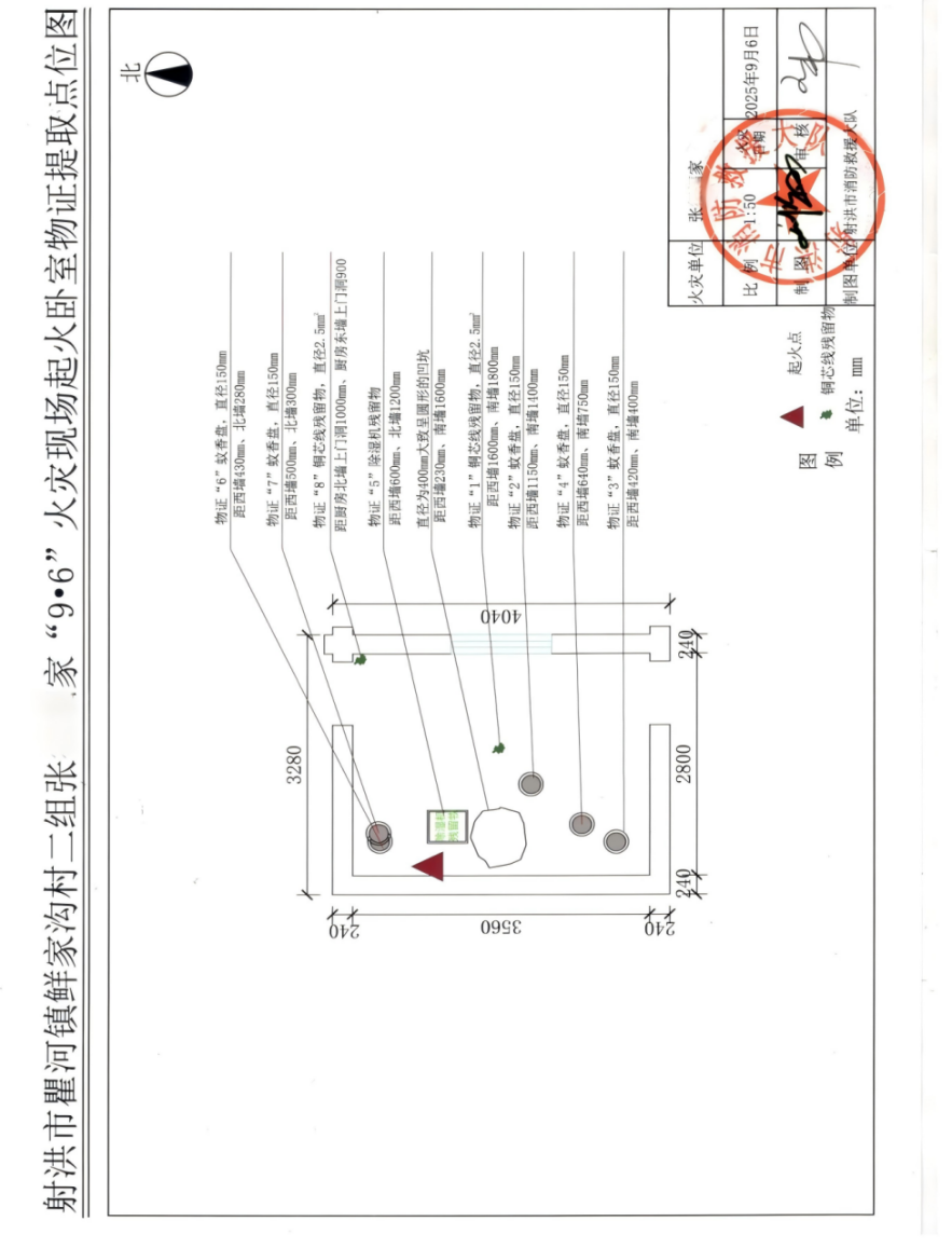 (2)现场勘验。经现场勘验并提取封装的物证“1”、物证“5”物证“8”送至应急管理部四川消防研究所司法鉴定中心进行鉴定,应急管理部四川消防研究所司法鉴定中心出具的《鉴定意见书》(应急消川研司鉴中心[2025]物鉴字第0947号)鉴定意见为“(一)1-1#和8-1#样品为火烧熔痕样品(二)5号物证中未提取到可供鉴定的金属熔痕样品”,且在国网四川射洪市供电有限责任公司调取的张x福2025年9月1日至9月6日电表电流曲线数据证实,火灾发生前6天的电流数据最大为当天12时15分的10.19A,查阅《低压配电设计规范》(GB50054-2011)等相关规范及文献,低压配电系统配电末端短路电流数值参照值在1KA-10KA,火灾发生时段的短路电流远远小于参照值。