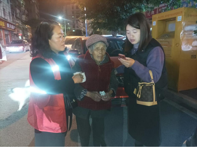 考虑到老人年事已高且夜间寒冷,工作人员小心翼翼地将老人搀扶至路边的木椅坐下。其中两位工作人员主动站在老人两侧,用身体为其遮挡凛冽的寒风。另一位工作人员则迅速利用老人的手机,熟练地联系其家属。在通话中,她清晰、冷静地说明了老人目前的状况、所在具体位置,并贴心安慰焦急的家人:“请放心,老人现在很安全,我们一直陪着他。”在等待家属到来的这段时间里,几位工作人员始终陪伴在侧,温言安抚老人情绪,现场氛围紧张却有序。