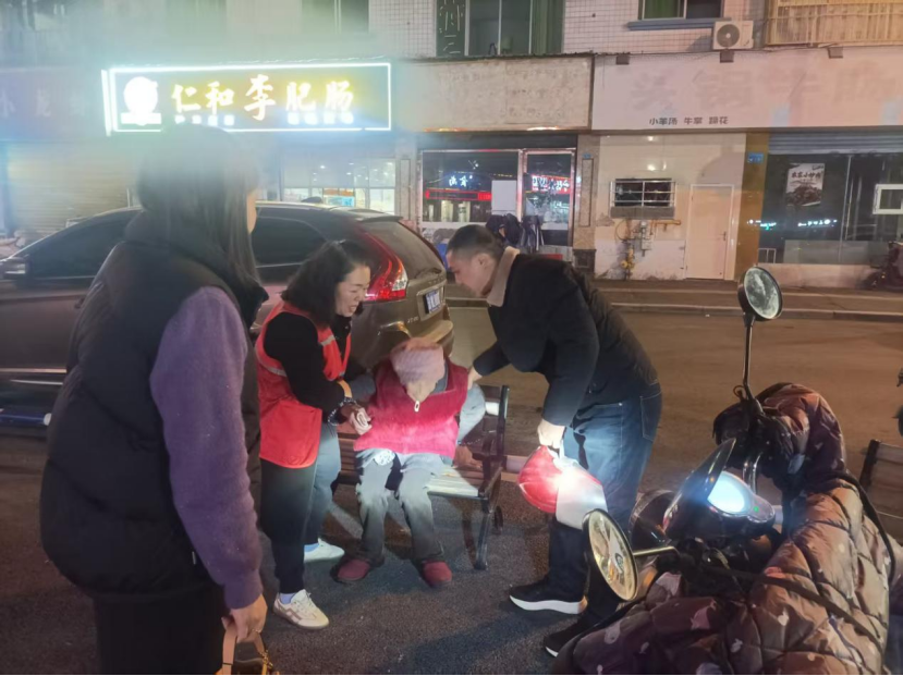 见此情形,何家桥社区工作人员没有丝毫犹豫,立刻上前俯身与老人沟通。经耐心询问得知,老人今年已86岁高龄,因天黑迷路,加之体力不支,不慎摔倒在地,无法自行起身。在确认老人意识清醒、无明显外伤后,工作人员细致地监测着老人的身体状况。