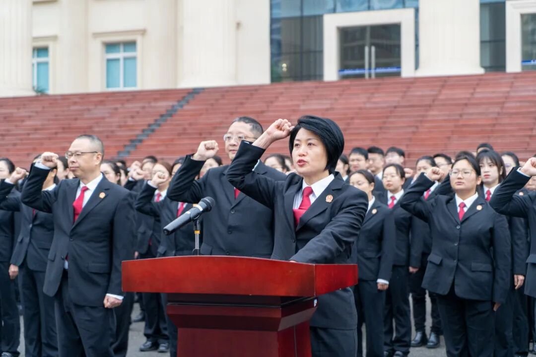 “我宣誓:忠于中华人民共和国宪法,维护宪法权威,履行法定职责……”在党组书记、院长周素全的领誓下,射洪法院全体干警高举右拳,面向国旗,庄严宣誓。铿锵有力的誓言回荡在法院上空,传递出对宪法的尊崇敬畏,更承载着司法为民的坚定初心。