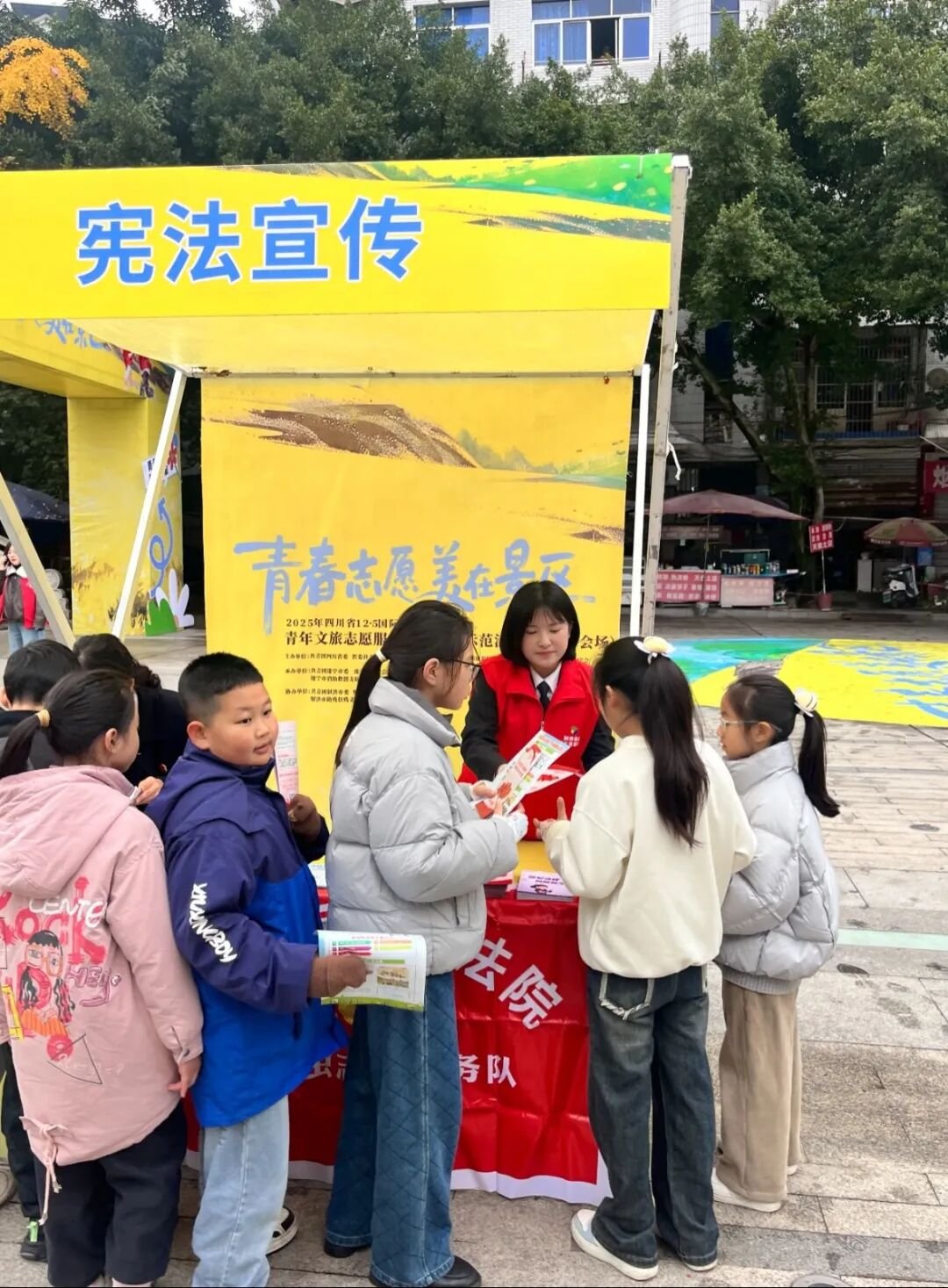 在花果山,射洪法院萤火虫志愿服务队在活动现场同步设置宣传点位,协同发力,向过往群众发放宪法宣传资料,以志愿力量助力宪法精神深入人心。