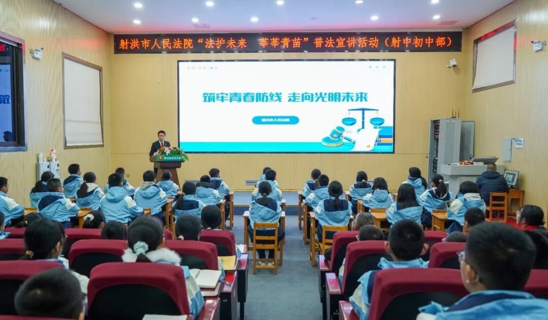 射洪法院走进射洪中学初中部,以“筑牢青春防线,走向光明未来”为主题,为全校5000余名师生带来一场生动深刻的法治宣讲,活动通过“现场授课+线上直播”方式展开。