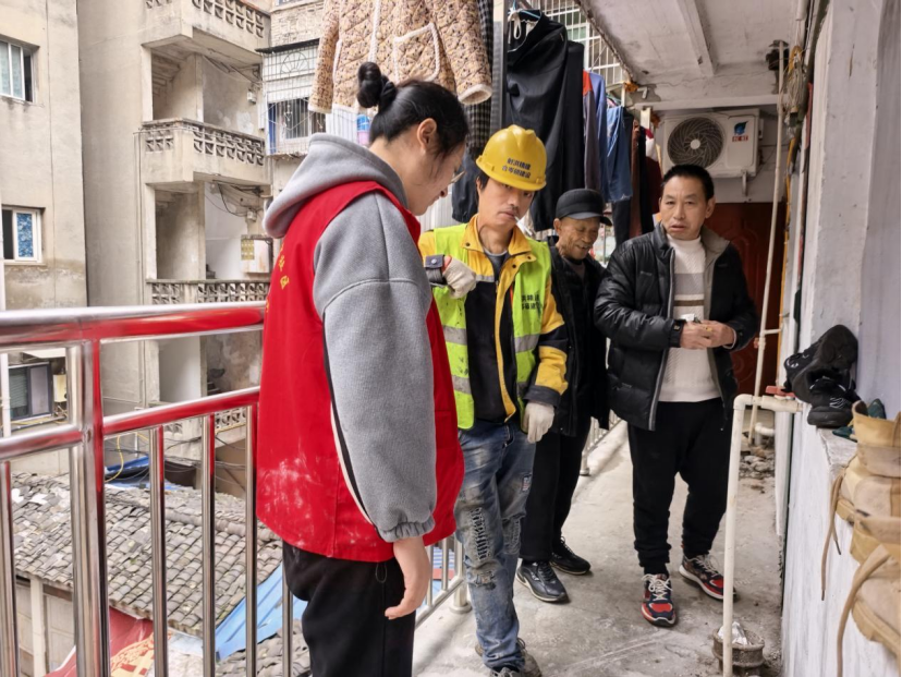 近日,射洪市太和街道三元宫社区兴月街28号小区居民反映,楼顶因雨水管排水不畅导致渗漏,影响日常生活。社区网格员周柳接报后迅速到场。