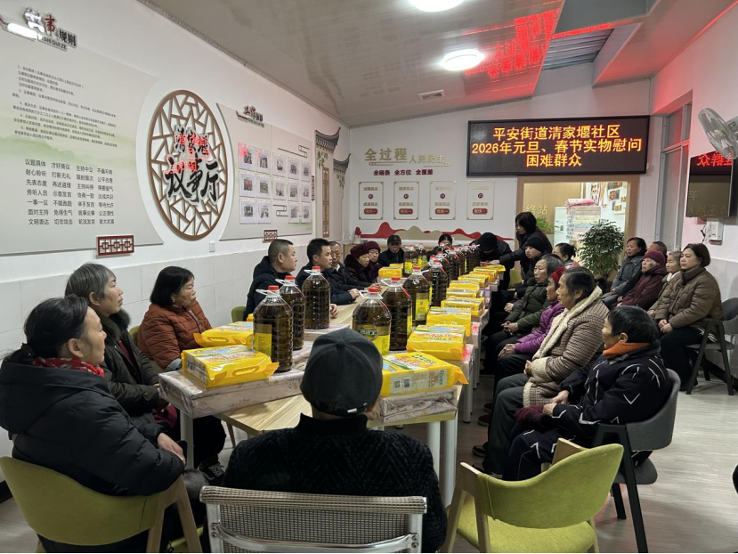 12月31日上午,射洪市平安街道清家堰社区开展2026年元旦、春节困难群众集中慰问活动,为辖区困难群众送上米、食用油、床上用品四件套等生活物资,把党和政府的关怀与节日祝福送到群众心坎上。平安街道办事处副主任、人武部部长王林出席活动并讲话。