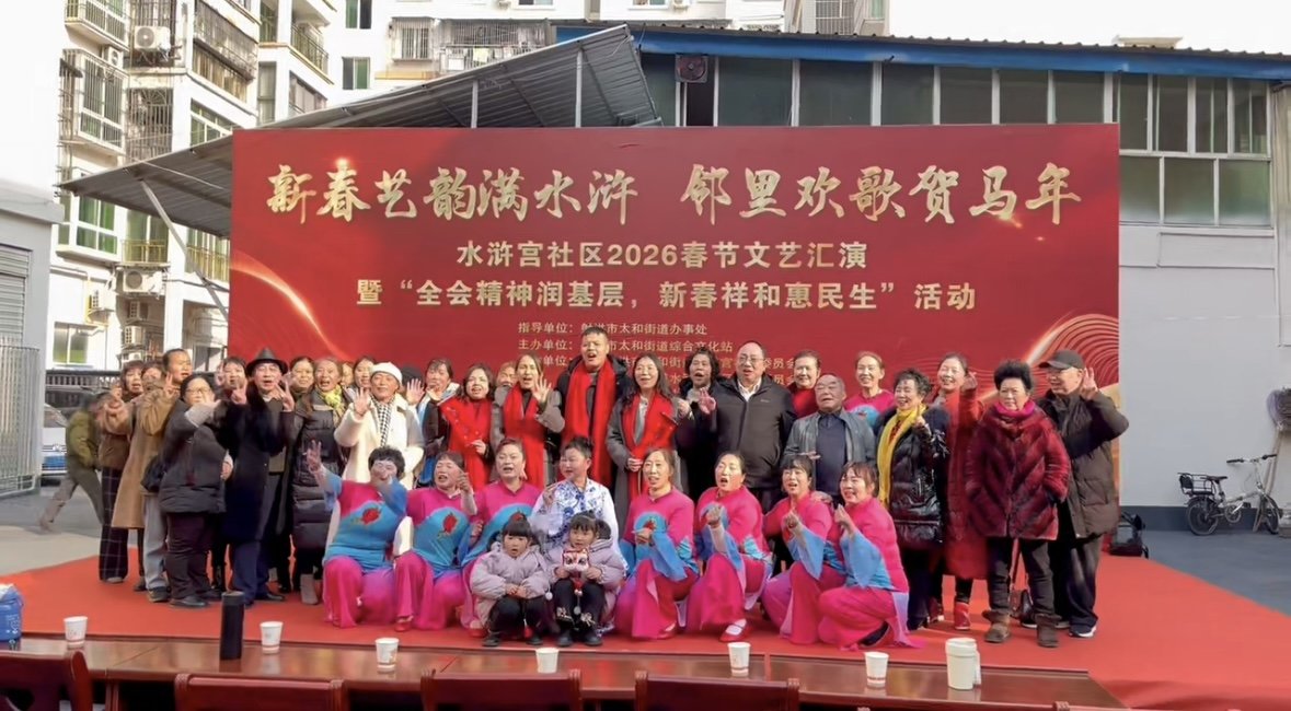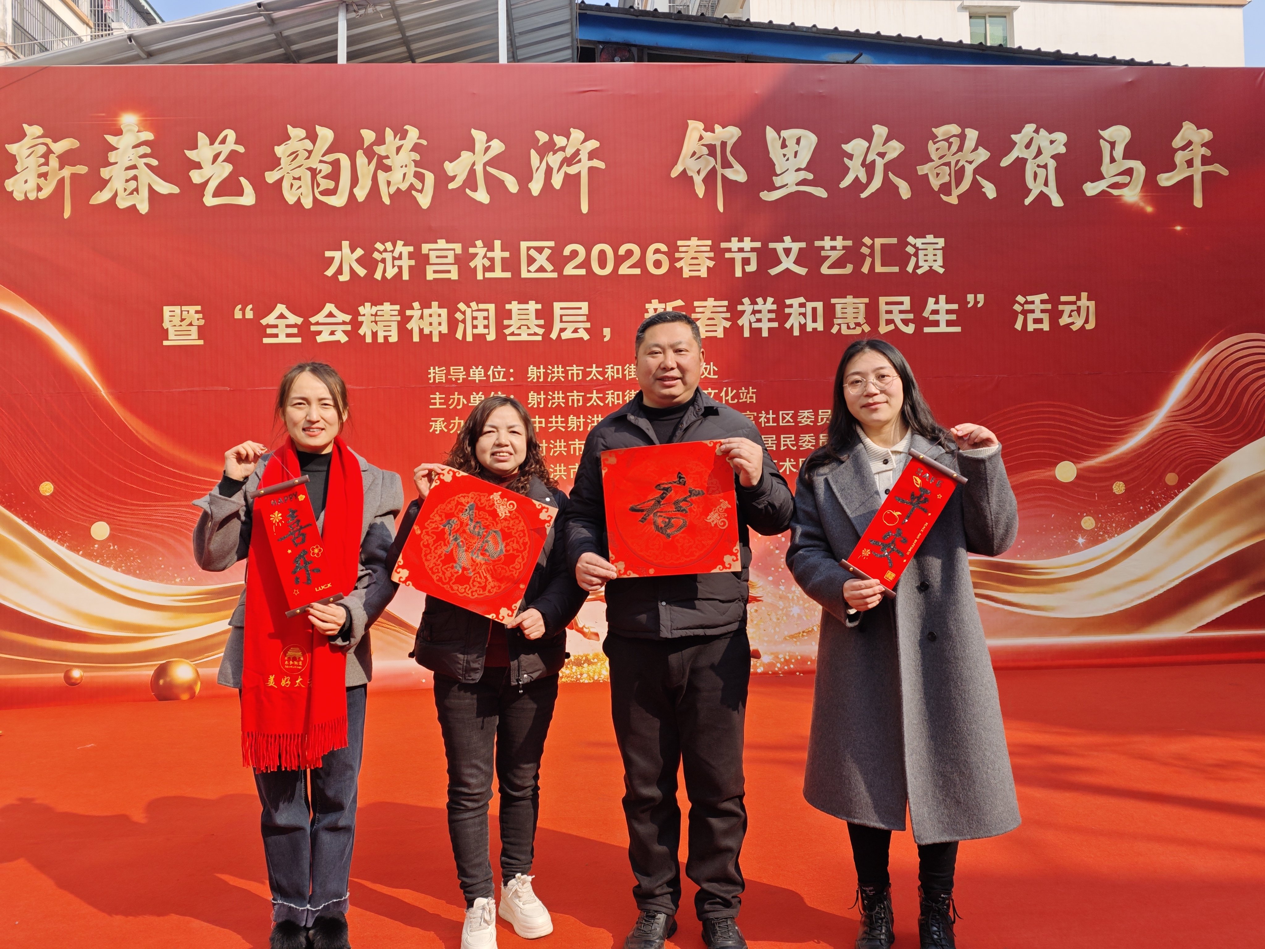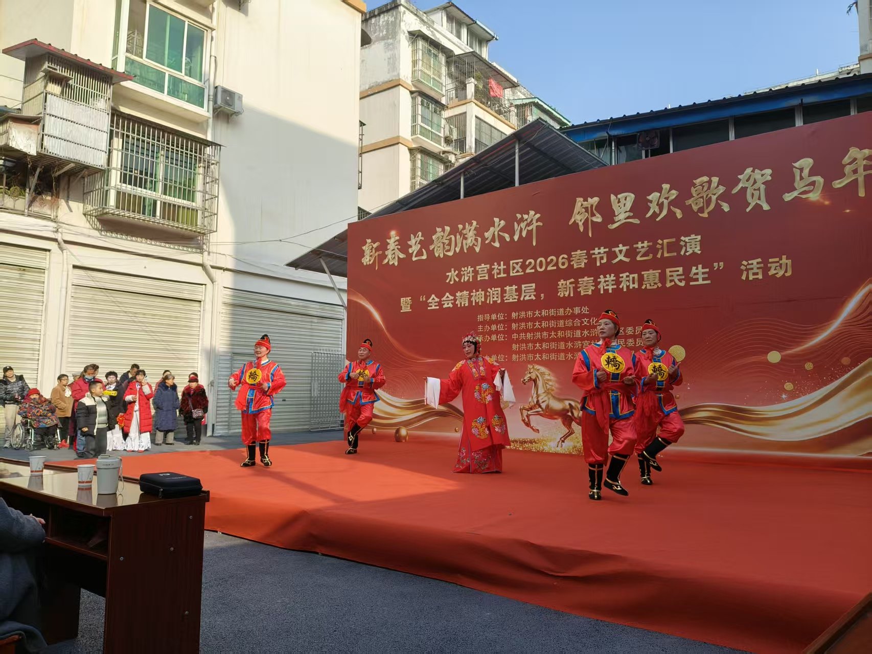 2月11日,射洪市太和街道水浒宫社区开展“新春艺韵满水浒 邻里欢歌贺马年”2026新春文艺汇演暨“全会精神润基层,新春祥和惠民生”主题活动。社区干部、街道干部、居民代表及辖区单位负责人共聚一堂,喜迎新春。