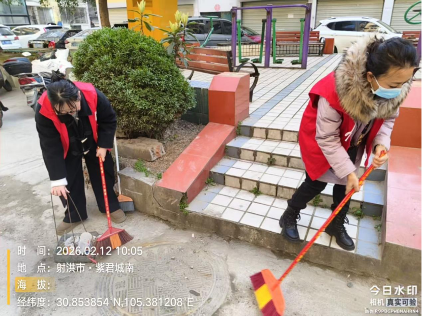 2月12日,射洪市太和街道黄磉浩社区组织工作人员与志愿者,在紫君城南小区开展节前环境卫生集中整治行动。社区党委书记谢宝红带队,以干净整洁、平安有序的小区面貌迎接马年新春。