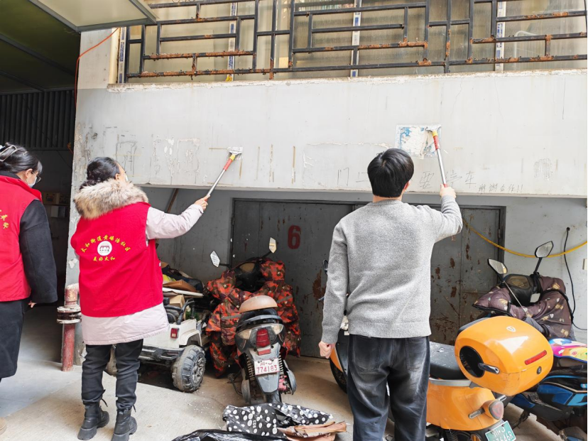 上午9时许,20余名社区工作人员和居民志愿者分工协作,对小区的楼道、消防通道、绿化带、垃圾桶周边及卫生死角展开拉网式清理。大家挥动扫帚清扫路面杂物,两人一组抬运积存垃圾与废弃家具,拿着铲子逐层铲除墙面“牛皮癣”,并将楼道堆放的旧纸箱、旧家具逐一清运下楼。
