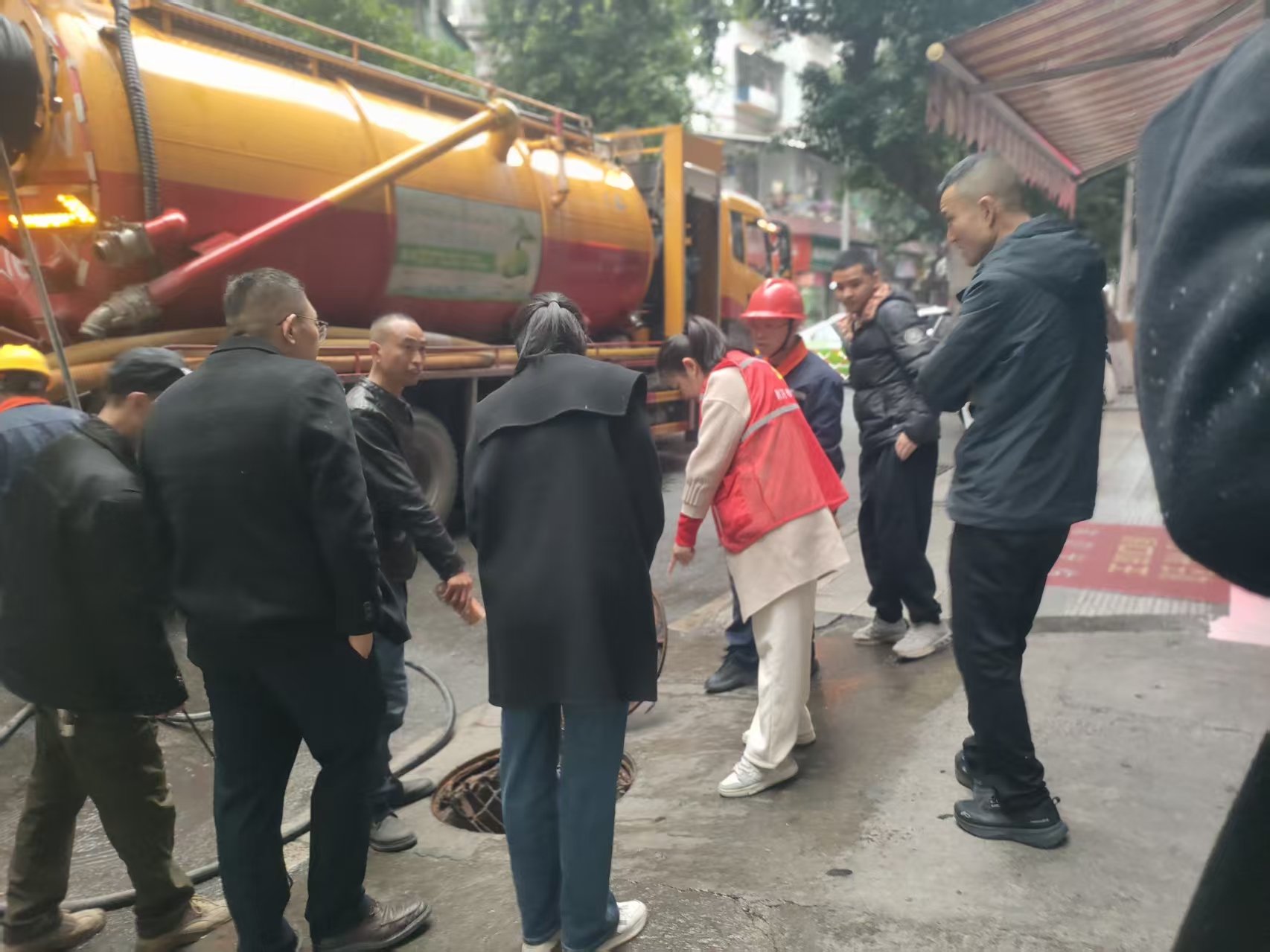 由于当天正值周六,为尽快解决居民“堵心”事,社区迅速启动应急协调机制,放弃周末休息时间,紧急联系环卫部门协调吸粪车及清掏人员赶到现场进行处置。在专业人员的操作下,吸污车对堵塞管道进行抽吸,工作人员同时对污水井内的淤泥和杂物进行了彻底清理。