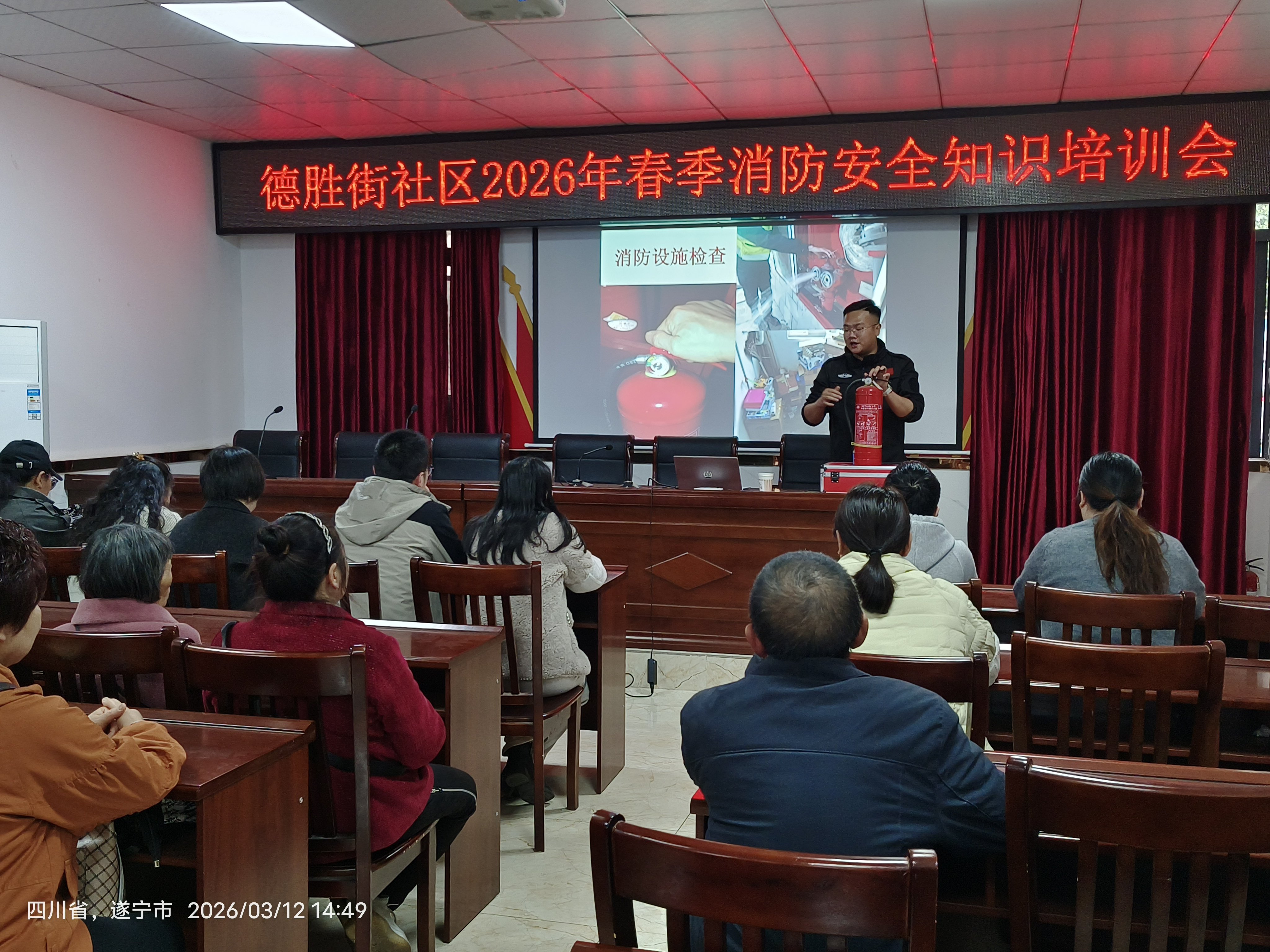 为进一步筑牢辖区消防安全防线,增强商户及居民的防火意识和自救互救能力,3月12日,射洪市太和街道德胜街社区在社区会议室组织了一场春季消防安全知识培训会。辖区内部分商家店铺负责人及居民代表参加了此次培训。